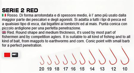 Rosso. Má zaoblený tvar a střední tloušťku, je to nejpoužívanější háček mezi většinou rybářů a závodníků. Hodí se na všechny typy rybaření a na jakoukoli návnadu, od červíků po patentky. Má kuželovou špičku s malým protihrotem pro dokonalé proniknutí