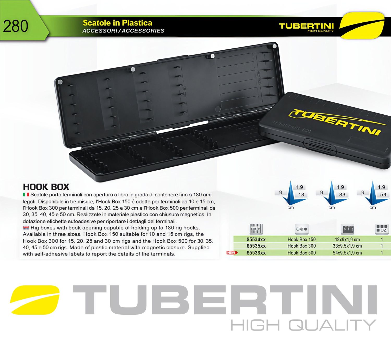 Rig boxy pojmou až 180 návazců. K dispozici ve třech velikostech: Hook Box 150 je ideální pro návazce o délce 10 a 15 cm, Hook Box 300 pro návazce o délce 15, 20, 25, 30 a 60 cm a Hook Box 500 pro návazce o délce 30, 35, 40, 45, 50, 100, 130, 145 a 150 cm. Vyrobeno z plastového materiálu s magnetickým zámkem. Součástí balení jsou samolepicí štítky pro označení detailů terminálů.