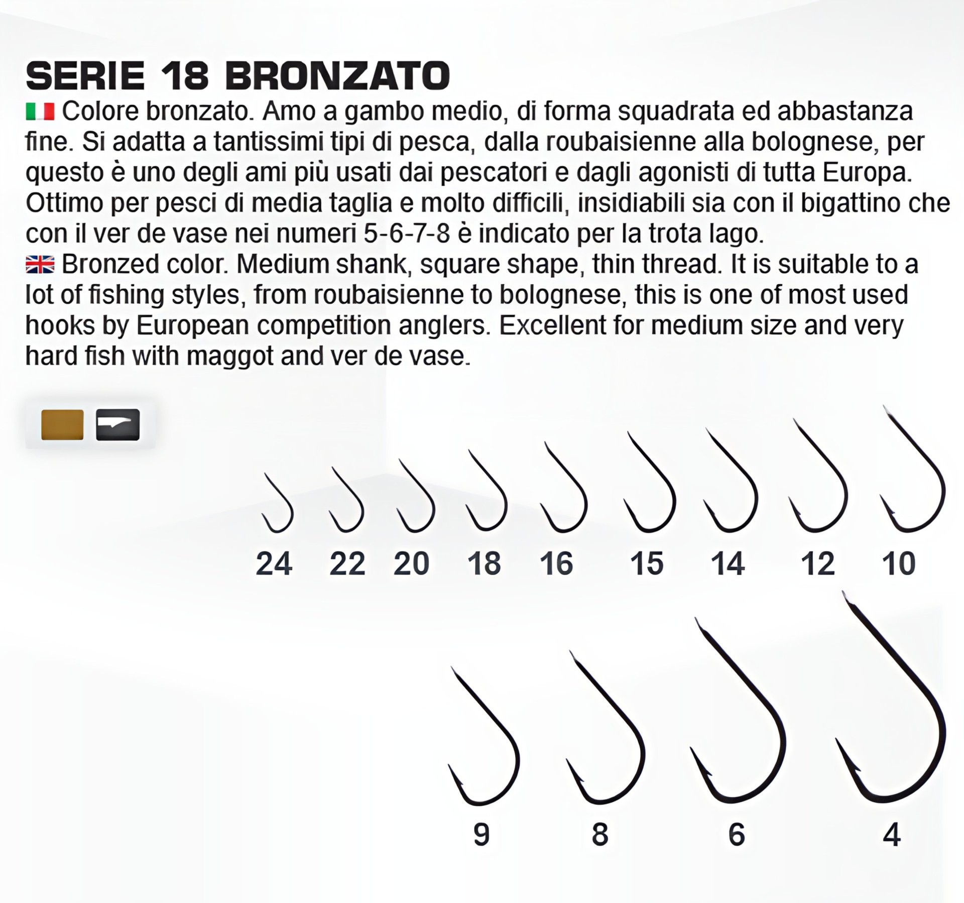 Bronzová barva. Střední hrot, čtvercový tvar, pro tenký vlasec. Hodí se na spoustu rybářských stylů, od feederu po bolognese. Tohle je jeden z nejpoužívanějších háčků evropskými závodními rybáři. Skvělý na středně velké a opatrné ryby, Ostatní velikosti na dotaz
