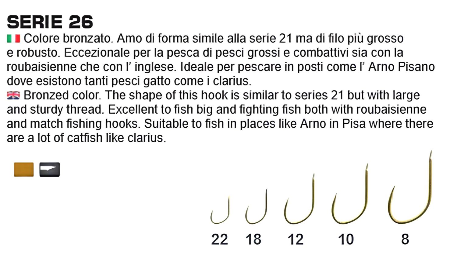 Bronzová barva. Tvar tohoto háčku je podobný sérii 21, ale je silný a robustní. Skvělý na lov velkých a bojovných ryb..