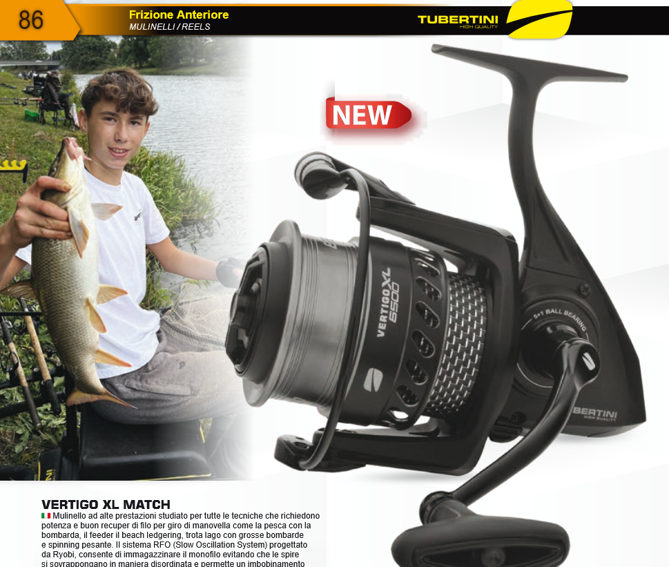 Naviják Tubertini Vertigo XL Match 6500 je vysoce výkonný naviják, navržený pro techniky lovu, feeder a plavaná pro rychlé navíjení vlasce. Díky systému RFO (Slow Oscillation System), vyvinutému společností Ryobi, zajišťuje dokonalé uložení vlasce bez překrývání, což umožňuje k plynulé navíjení a zlepšuje odhozový výkon. Naviják je standardně vybaven hliníkovou cívkou.